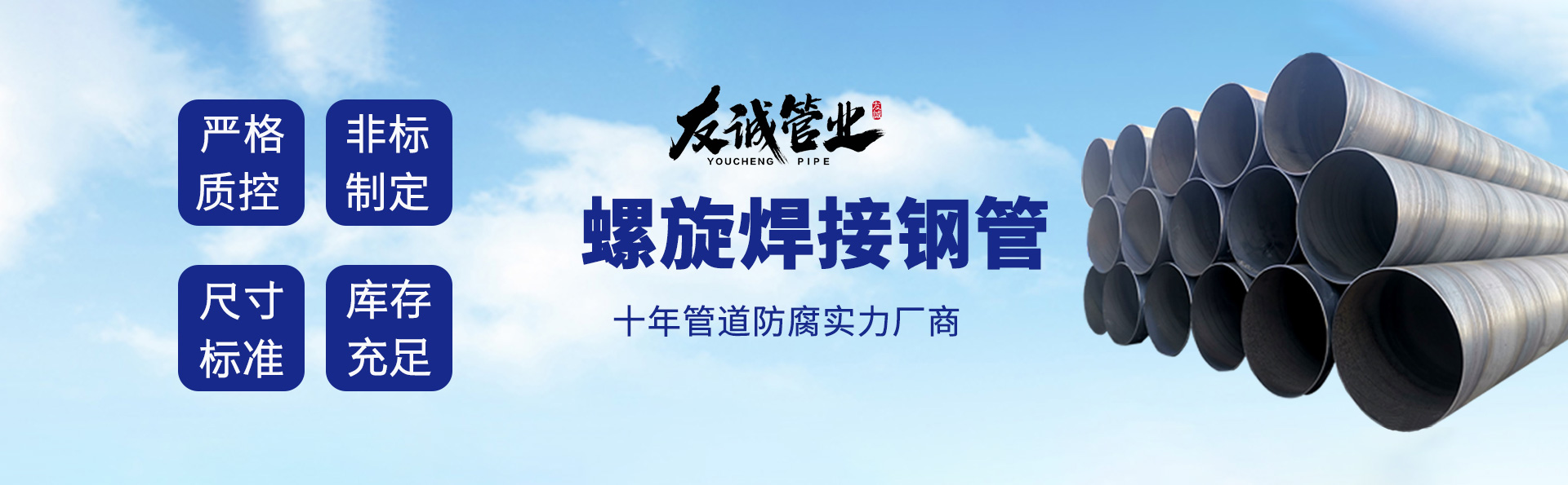 滄州友誠管業(yè)有限公司是一家專業(yè)從事生產(chǎn)防腐涂塑管道及管件于一體的大型企業(yè)。公司注冊資金8600萬元,位于中國管道生產(chǎn)基地—河北鹽山縣,近靠京滬高速、榮烏高速、黃石高速30公里,高鐵滄州西站40公里,天津國際機場、濟南遙墻機場150公里,為客戶來訪及業(yè)務發(fā)展提供了便利的交通條件。 鋼管系列:螺旋鋼管、無縫鋼管、ERW直縫焊管、JCOE埋弧焊直縫鋼管、熱鍍鋅鋼管。 涂塑系列:內外涂塑鋼管、涂塑復合鋼…… 了解更多